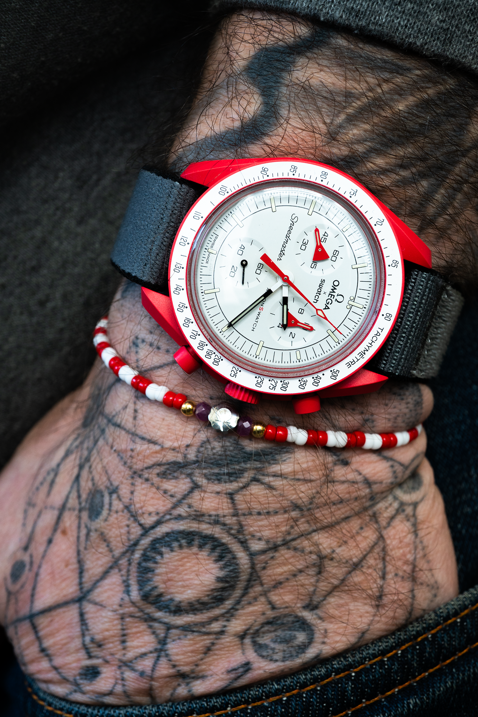 Inspired by Tintin's adventures and Omega's space legacy, Mission to the Moon features a combination of white and red glass beads, reminiscent of both Tintin's iconic red rocket and the Tintin Omega Speedy Pro.